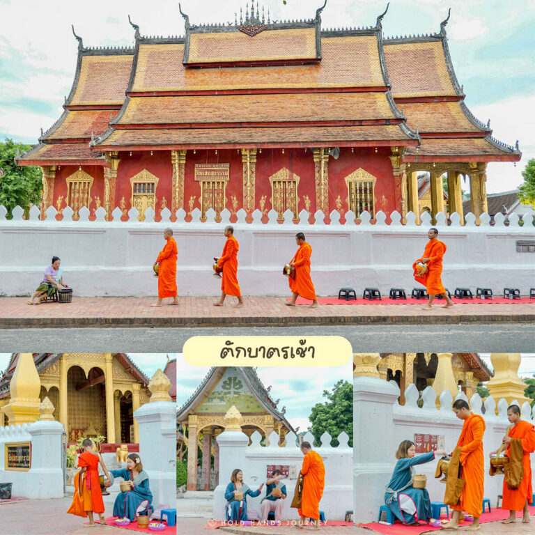 เช้าวันสุดท้ายของการเดินทาง พี่กับหนูเราตื่นแต่เช้าตรู่ ฟ้ายังไม่ทันสว่าง เพื่อมาตักบาตรข้าวเหนียวกัน พิกัดที่พี่กับหนูมากันก็คือหน้าวัดแสนสุขาราม อีกหนึ่งเสน่ห์ของเมืองหลวงพระบาง เมืองมรดกโลกที่ต้องห้ามพลาด คือการตักบาตรข้าวเหนียว ราคาราวๆ 80 บาทต่อหนึ่งชุด มีขายที่แถวบริเวณหน้าวัดเลย ซึ่งที่นี่มีพระสงฆ์และสามเณรกว่าร้อยรูป เดินบิณฑบาตในยามเช้า เราสามารถใส่ได้ตามจุดต่างๆ ที่เค้าจัดเตรียมไว้ให้เลยนะ ในช่วงเช้าแบบนี้ เราจะได้เห็นทั้งนักท่องเที่ยว และชาวบ้านออกมาตักบาตรร่วมกัน เป็นภาพที่น่าประทับใจมากๆ และยังเป็นการสืบสานวัฒนธรรมวิถีชีวิตของชาวหลวงพระบางอีกด้วย