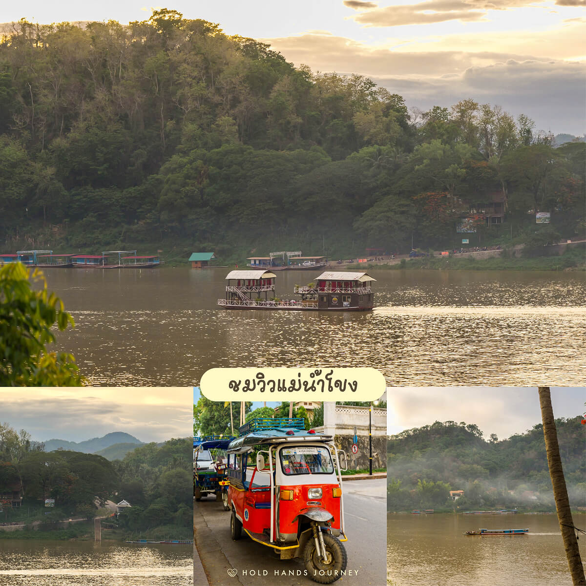 ในช่วงเย็นหากใครไม่ได้ขึ้นพระธาตุพูสี อีกหนึ่งกิจกรรมที่เราอยากแนะนำคือมาเดินชมวิวแม่น้ำโขงยามเย็น แสงสะท้อนสีทองของพระอาทิตย์กระทบบนผิวน้ำสวยจับใจ แถมเราจะเห็นเรือรับจ้างข้ามฟากและเรือนำเที่ยวแม่น้ำโขงแล่นผ่านไปมา